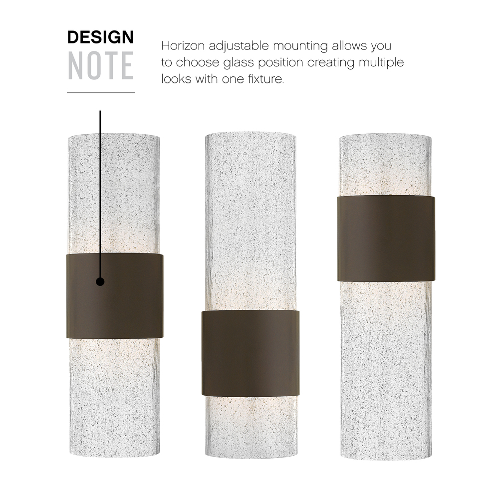 Horizon's simple elegance emphasizes its dominant expanse of clear seedy glass finished with a flame-polished edge. This versatile fixture is constructed of die-cast aluminum and can be mounted horizontally, vertically or on the ceiling. The center band is uniquely adjustable to allow flexible mounting options. The open top and bottom maximizes the output of the dimmable LED light source.