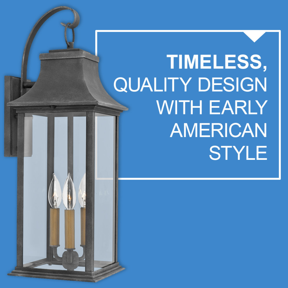 Inspired by the early American coach lights popular throughout New England, Adair features a clean and stately form composed of hardy aluminum. An Aged Zinc finish accented by either Heritage Brass or Antique Nickel candle sleeves is complemented with robust construction details.