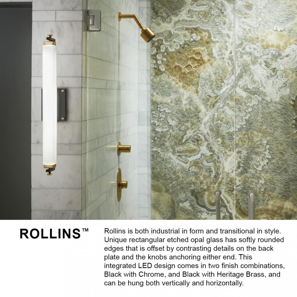 Rollins is both industrial in form and transitional in style. Unique rectangular etched opal glass has softly rounded edges offset by contrasting details on the backplate and the square knobs anchoring either end. This integrated LED design comes in two finish combinations, Black with Chrome and Black with Heritage Brass, and can be hung both vertically and horizontally.