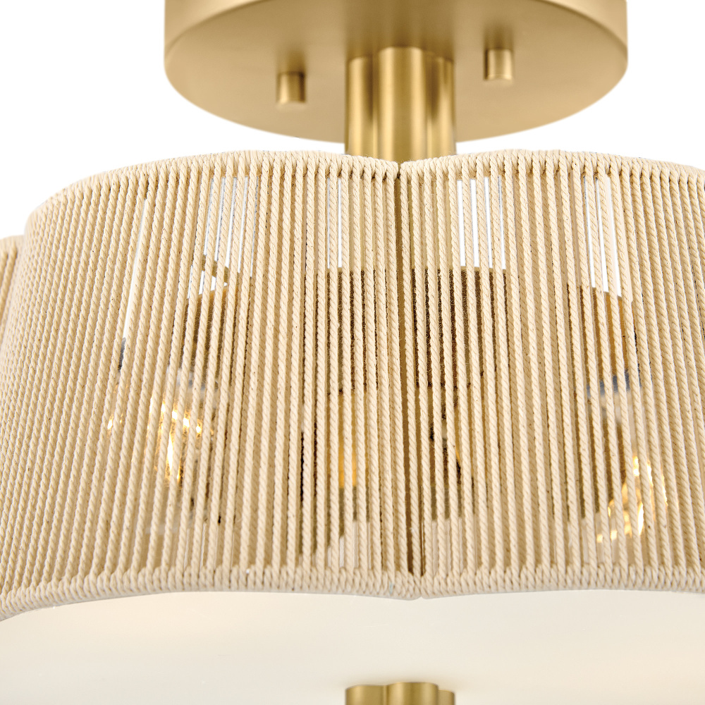 A chic yet casual decor statement infused with natural texture, Sasha’s subtly tapered, scalloped shade is hand-wrapped in natural-fiber cord, imparting an unexpected element of sheer softness to your decor. A clover-shaped Etched glass diffuser glows with welcoming illumination, secured by a complementing clover finial and a frame finished in Lacquered Brass.