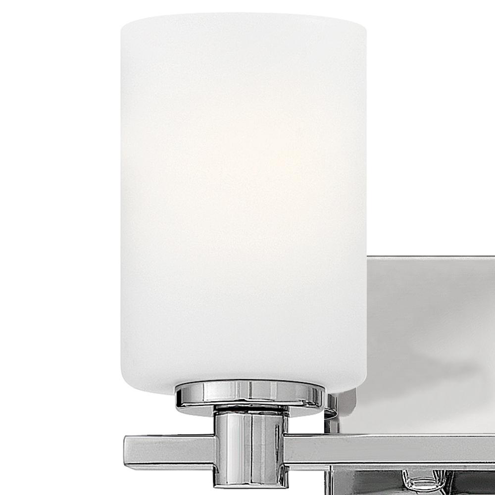 Karlie's clean design is transitional in style and will complement a variety of décor. Featuring precision die-cast cups and cylindrical, etched opal glass, it is available in Brushed Nickel and Chrome.
