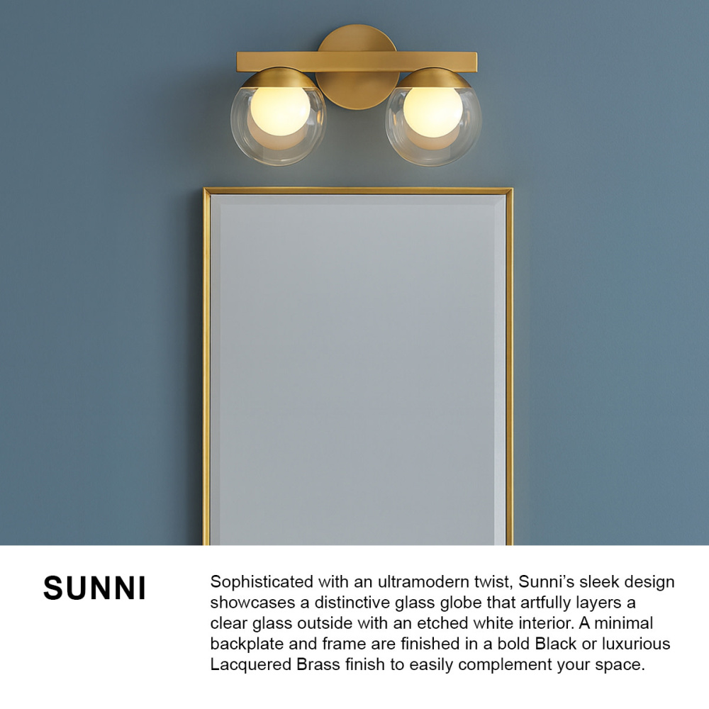 Sophisticated with an ultramodern twist, Sunni’s sleek design showcases a distinctive glass globe that artfully layers a clear glass outside with an etched white interior. A minimal backplate and frame are finished in a bold Black or luxurious Lacquered Brass finish to easily complement your space.