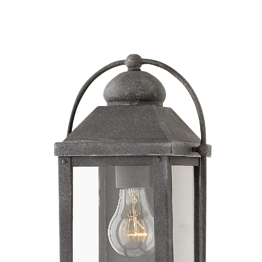 Anchorage is an early American lantern design crafted of solid aluminum to reflect a bold yet refined silhouette. The Aged Zinc or Light Oiled Bronze finish and clear glass complement the long clean lines, elegant arched carriage handle and sturdy knobs, resulting in a vintage style with classic charisma.