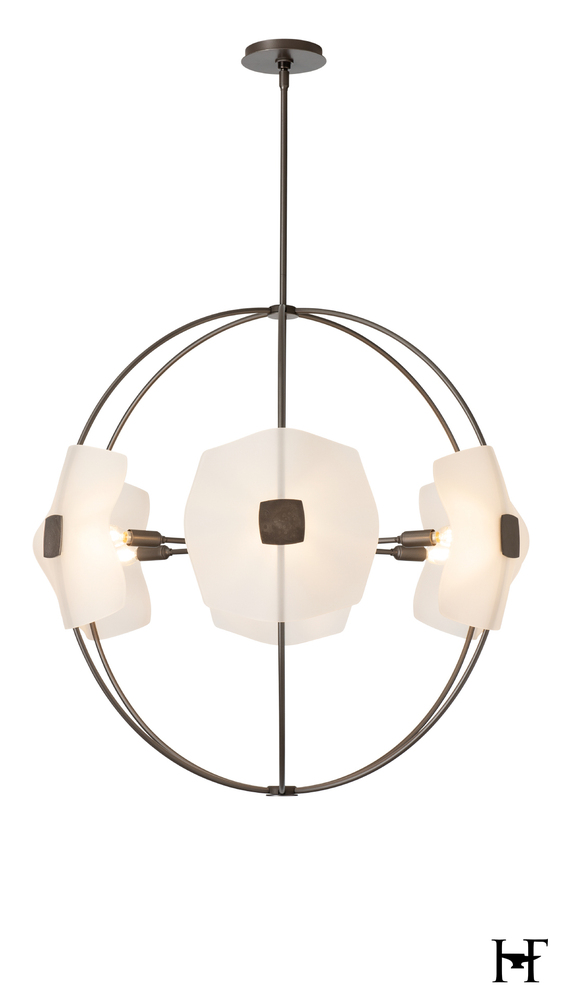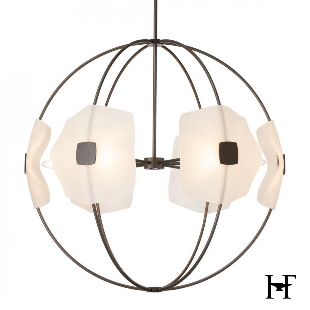The six light Astra Orb Small Pendant features gently slumped handmade glass, complementing each curved metal arm of the fixture. Each stunning piece of glass is held in place by a hand-forged medallion for a sophisticated look.