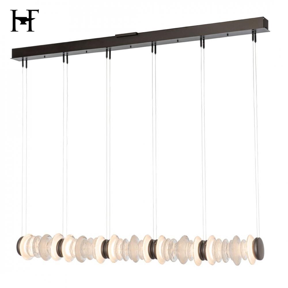 An addition to the Cairn Collection, this pendant tips the vertical glass "stone" stacks to a horizontal in this wonderful linear version. Round, textured clear and bubble glass of varying diameters are positioned side by side. Each of five "stacks" is bookended by metal, stone-shaped LED modules to great visual effect. Cable-hung, the Cairn Linear LED Pendant boasts a 4.7ft expanse, creating a stunning piece that is at home over a kitchen island, bar or reception counter, a dining table, a billiards table, and more.