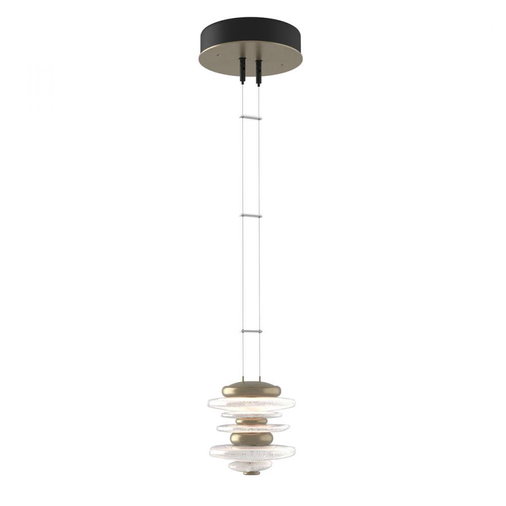 The Hubbardton Forge Cairn Pendant pays homage to the enigmatic stone sculptures, used since ancient times as landmarks. Thick hand-poured glass and cast steel “stones” are artistically stacked, and suspended by thin cables. Light flows over the steel and through the glass to seemingly glow from the inside. Also available as a Large Mini Pendant.