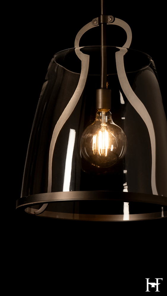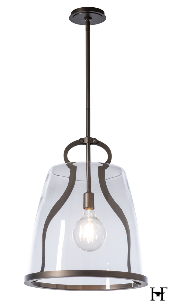 This large Caliper Pendant gives scale to our popular design. At over 16" in diameter, this Caliper is large enough to hang as a single fixture in a breakfast nook, or a double over most kitchen counters. With the metal feature designed to resemble an antique tool, the Caliper's large glass shade is supported by this "tool" and lower metal rim.