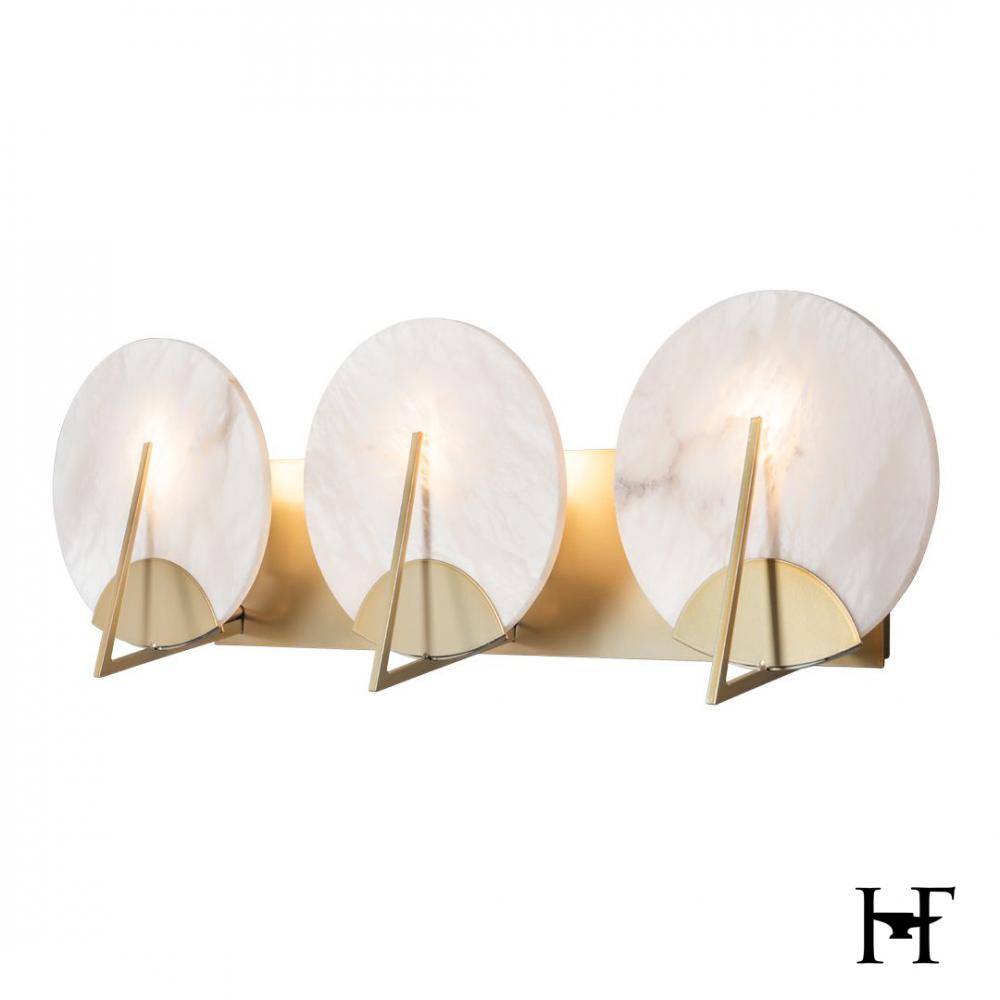 Natural alabaster discs from Spain is positioned before three lights and held with beautiful handcrafted steel semi-circles and a vertical steel tige for a contemporary touch. Designed by Ori Goldberg, this elegant 3-Light Bath Sconce joins the Callisto Collection that includes a semi-flush, a 1-light sconce and a beautiful 7-light pendant.