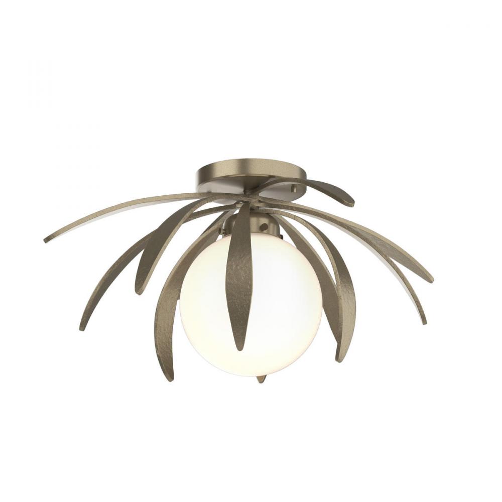 True to the beauty of its namesake flower, the Dahlia Flush Mount fixture provides a sculptural botanic aesthetic. Handcrafted forged steel “petals” flare outward and downward to embrace a glass globe containing a singular light source at its center. Available in 9 standard finishes. In addition to the flush mount, the Dahlia Collection includes chandeliers and mini pendant options to grace any space. Can also be wall mounted as a sconce.