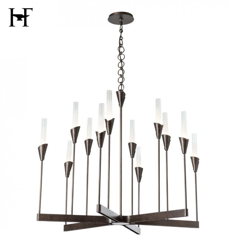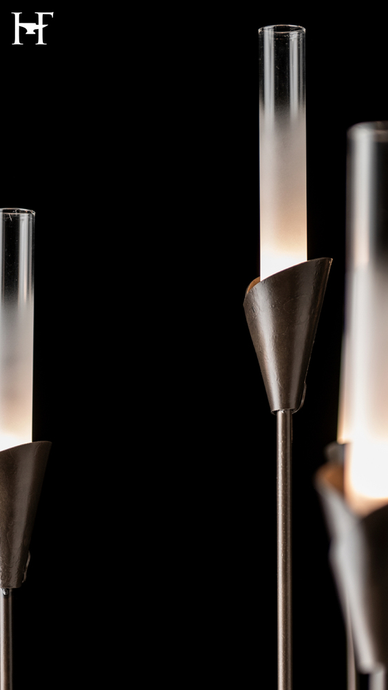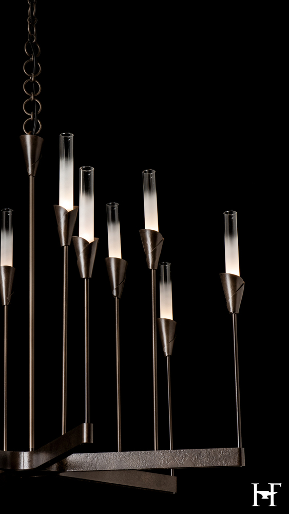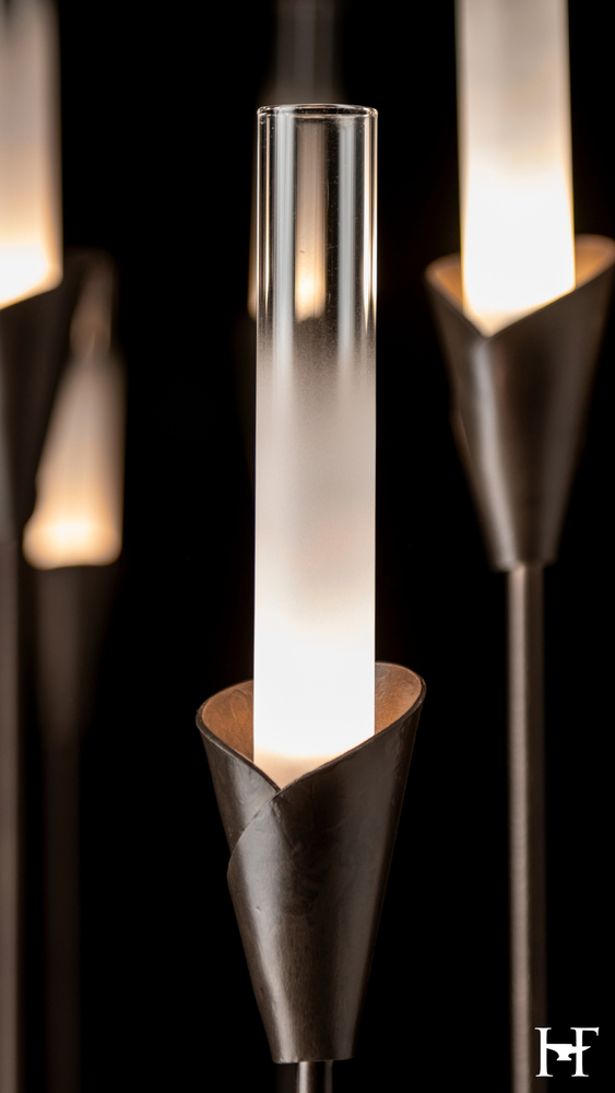 This botanically inspired lighting fixture resembles a field of lilies standing tall. This 12 light, two-tiered chandelier with clean lines features hand-forged tall "cups" that hold vertical gradient-frosted cylindrical glass tubes housing the light within. Paul Marr Hilliard designed the cup's shape to resemble a lily's receptacle, as if giving life to the light.