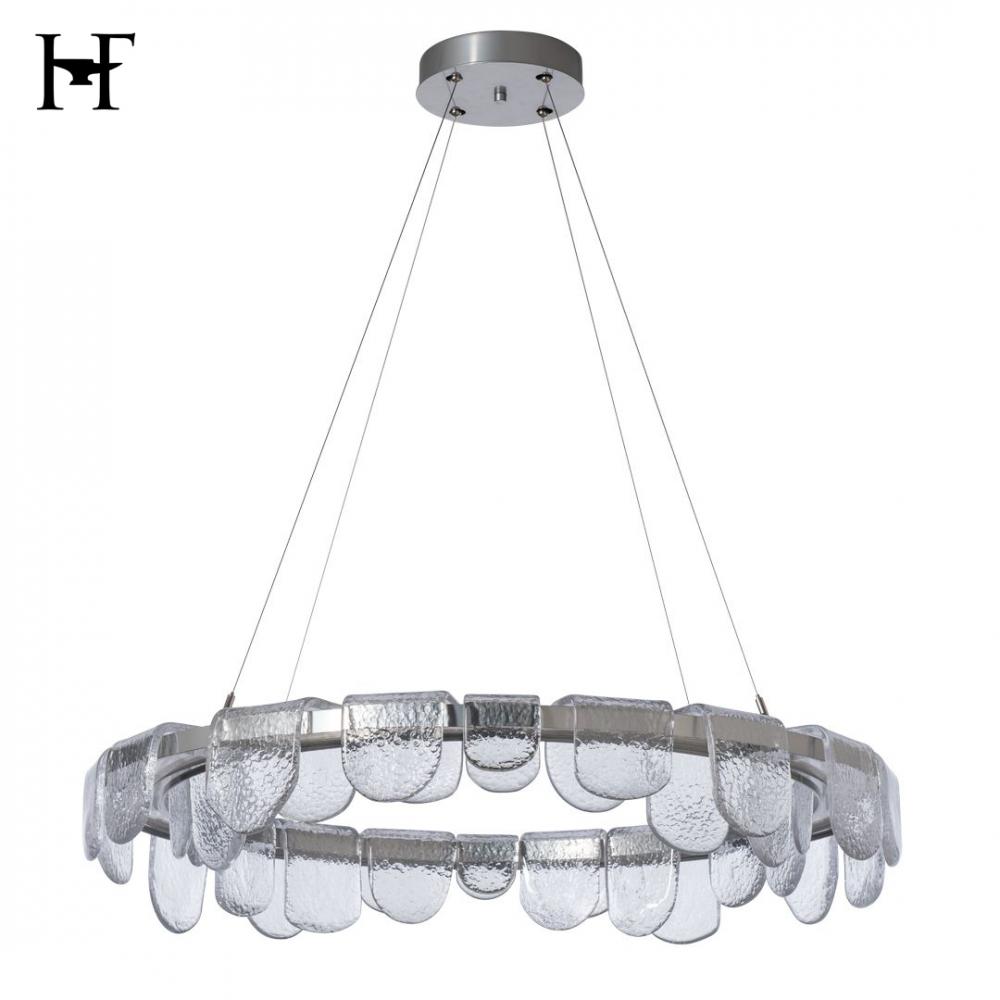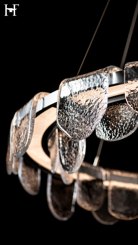 A riverbed of light. Stunning heavily-textured, clear poured artisanal glass in varying sizes are formed and shaped, then positioned on a round LED light-guide platform to stunning visual effect. Inspired by the cold icy streams of Vermont, adorned with ice-covered rocks and boulders, designer Andy Morter envisioned the Riverbed Collection to be like the frozen stones set along the river’s edge.