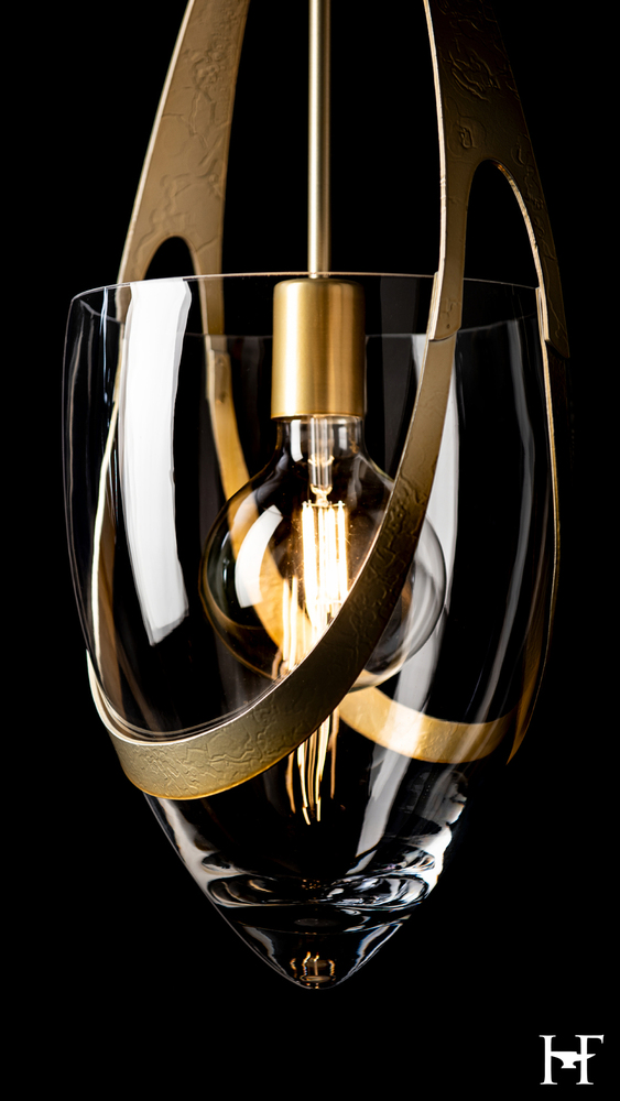 Designed by Jason Hancock, the Vaso's conically-shaped glass has a very substantial and shaped base that is nestled within a beautiful handcrafted, forged steel "strap". May be hung singly or in multiples.