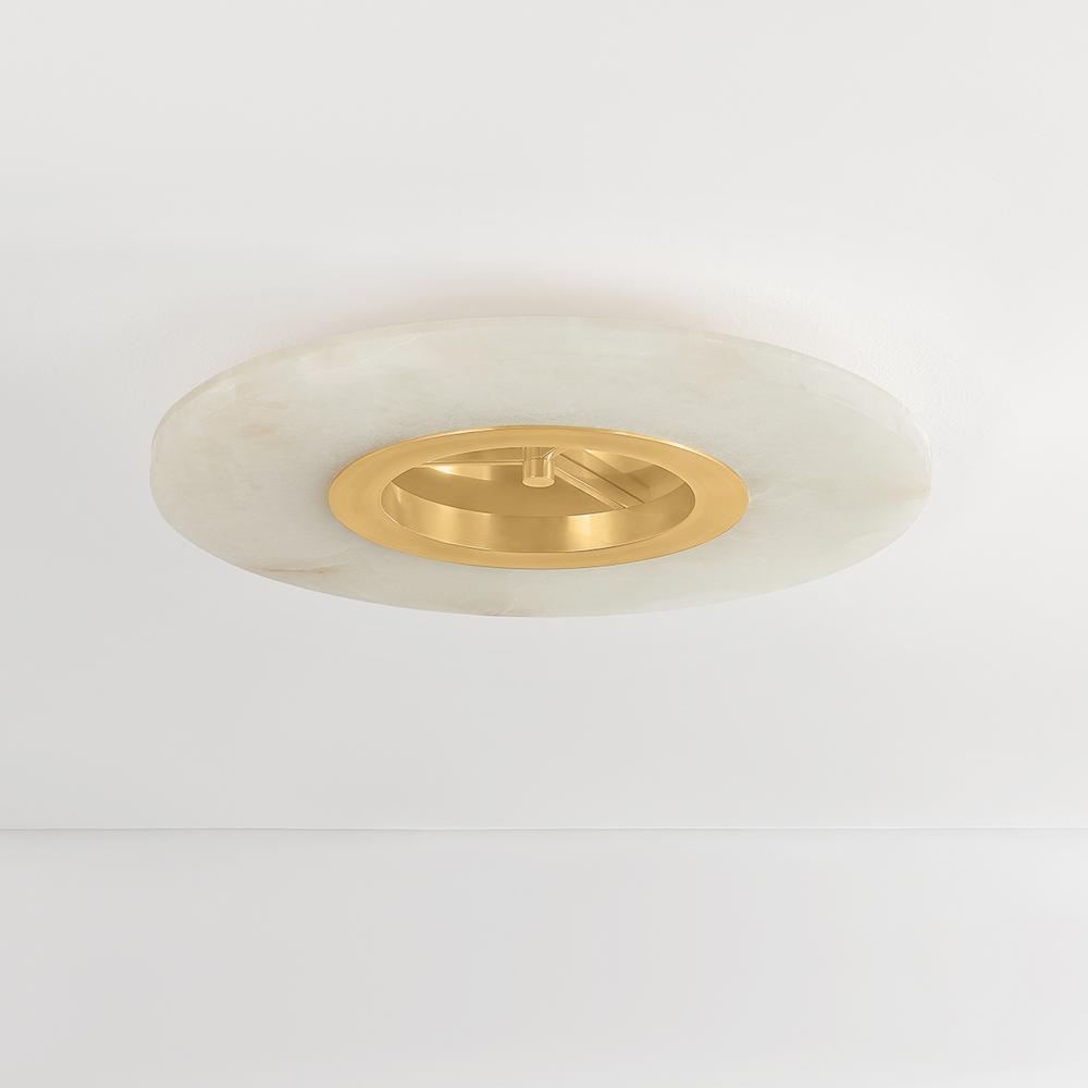 The Alto flush mount serves as a striking sculptural piece on the ceiling. When illuminated, the natural alabaster comes alive with intricate veining, creating an upscale, yet minimalist lighting effect. While the fixture feels fresh, the Aged Brass frame lends Alto an antique feel. Due to the one-of-a-kind nature of the medium, exact colors and patterns may vary slightly from the image shown.