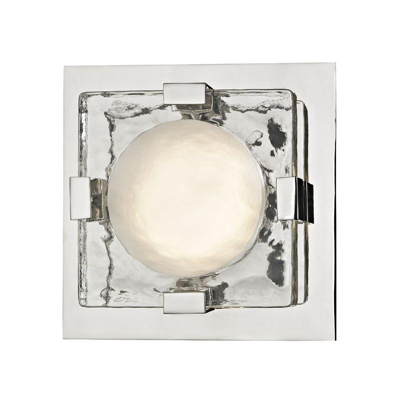 Bourne’s visual heft makes a statement. A very thick pane of glass, etched with a concave divot on its back and clear with a convex mound on its front, is mounted to a canopy or floating backplate, making for a mood-enhancing light diffusion.