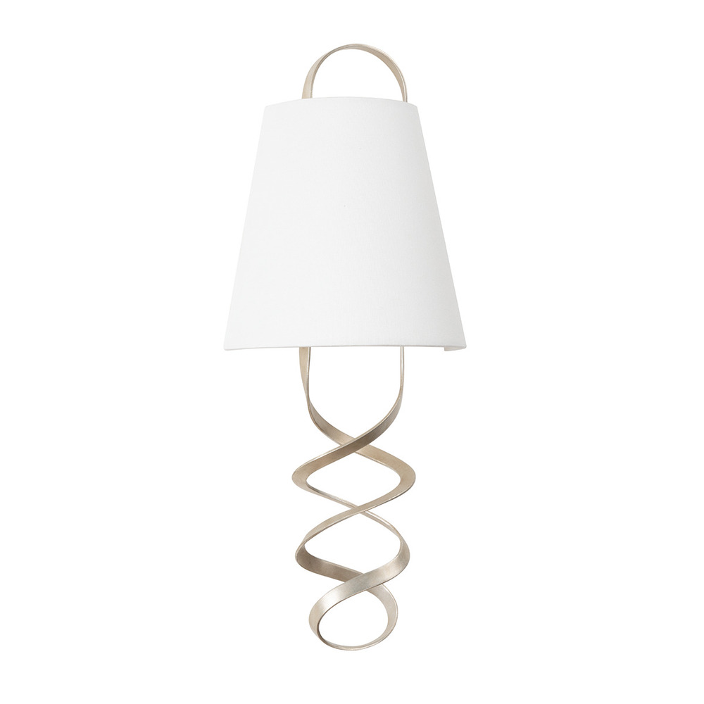 Dota's gorgeous flowing lines are the highlight of this playful yet elegant sconce. Curved metalwork in Vintage Gold Leaf or Warm Silver Leaf twists and swirls in a tranquil loop that draws the eye and creates an open, airy spiral silhouette against the wall. The tapered white linen shade grounds the design and adds a traditional element that makes the piece extremely useable.
