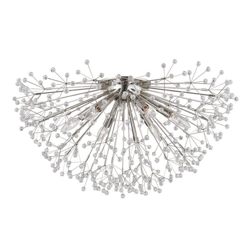 The earthly and the extraterrestrial combine in this beautiful, branching family. Faceted crystal spheres bedazzle at the end of every branch, luminously refracting the light. Like a star being born, Dunkirk is at once organic and out of this world. When Sarfatti designed the first chandelier that launched the Sputnik-style craze, it had been fireworks he was trying to emulate. There is something both of the firework exploding and the fixtures Sarfatti inspired in this opulent piece.