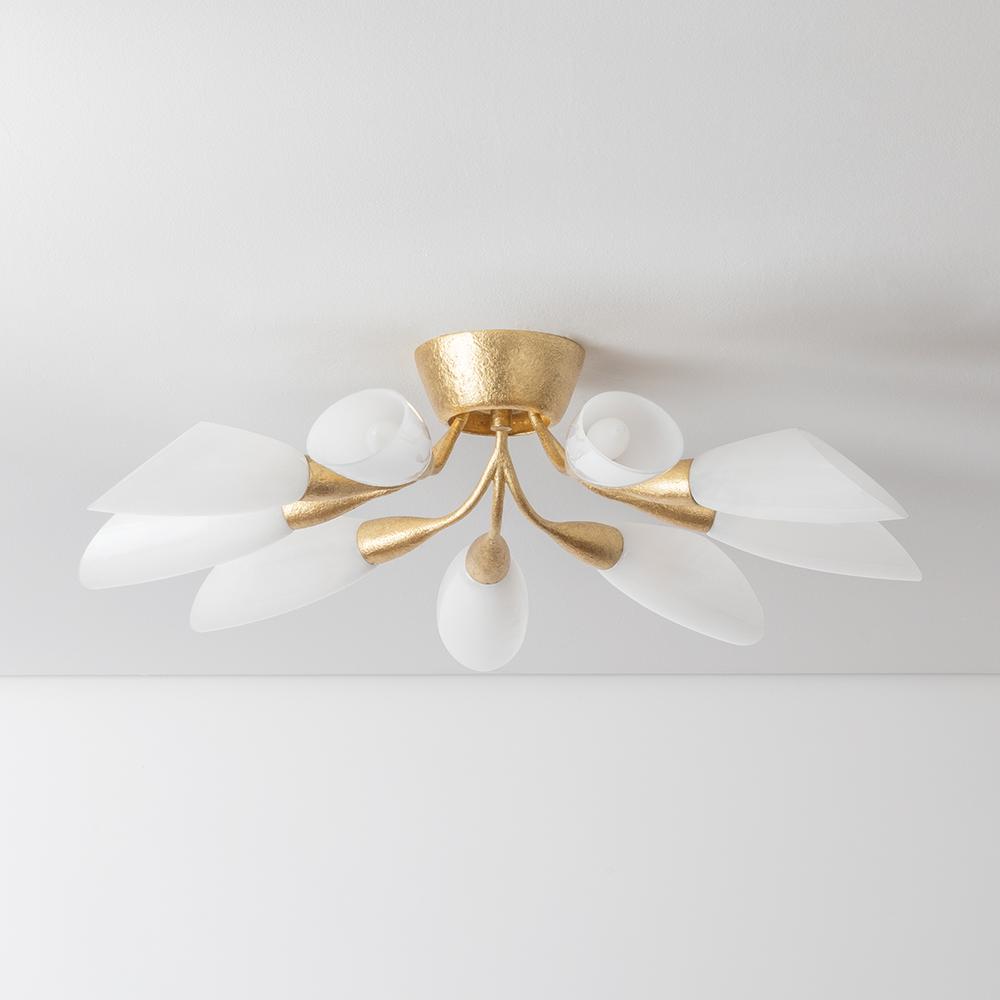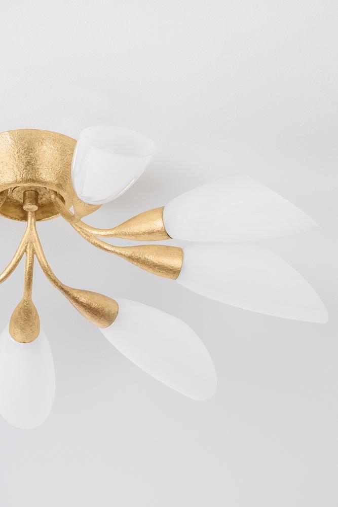 The botanical silhouette of Enfield features a sleek branching profile in scaled-up proportions. Cloud glass shades inspired by floral blooms offer a soft, contemporary feel with bias-cut ends that direct light upwards. The elongated, slender ‘stems’ embody a modern aesthetic, enhanced by the luxurious Vintage Gold Leaf finish.