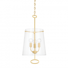 Inspired by early 20th Century Belgian antiques, James is a charming addition to any space. Playing with direction, a series of upward swooping arms are encased by a downward-facing clear glass shade. A smooth metal loop that tilts inward at the top is perfectly complemented by a matching metal loop that tilts outward at the bottom. Choose James as a 3- or 4-light pendant or 2-light sconce in Aged Brass or Polished Nickel.