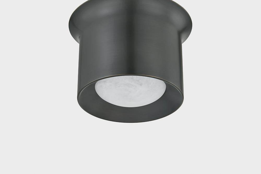 A sleek flush mount with unadorned metalwork, Noxon celebrates the beauty of simplicity. Situated within the metal frame, the matte cloud glass shade washes light around the reflector. with a gentle swell at the canopy, the frame creates the effect of flowing into the ceiling. Noxon is available in a classic Aged Brass or more industrial Distressed Bronze finish.