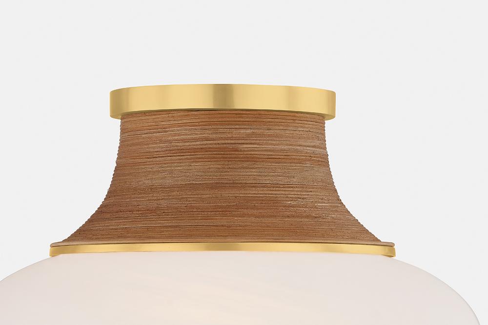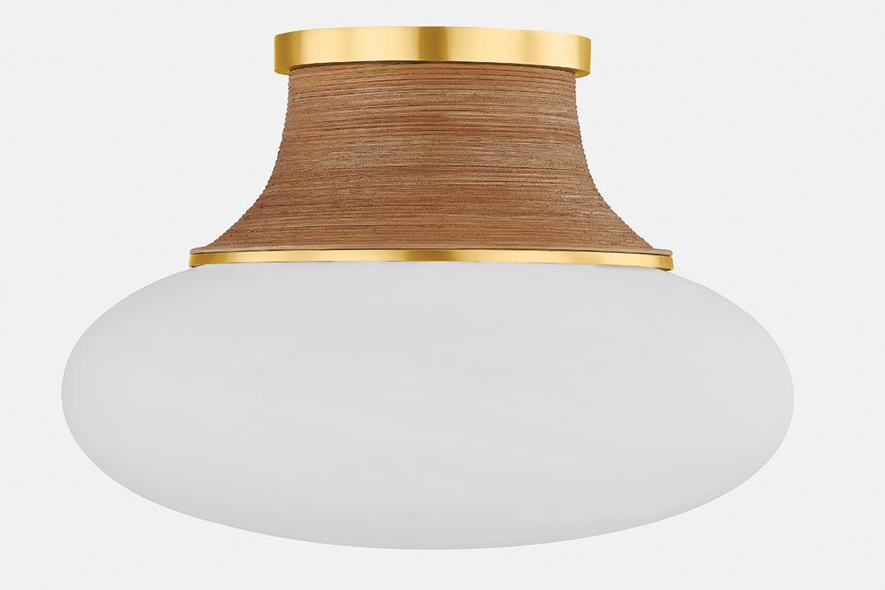 Natural textures and matte cloud glass soften the modern form of Pearl River. This imaginative semi flush mount features an oblong shade accented by hand-wrapped rattan details. An Aged Brass canopy and fitter add a luxe touch to round out this coastal-inspired fixture, which is available in two sizes. Due to the one-of-a-kind nature of the medium, exact colors and patterns may vary slightly from the image shown.