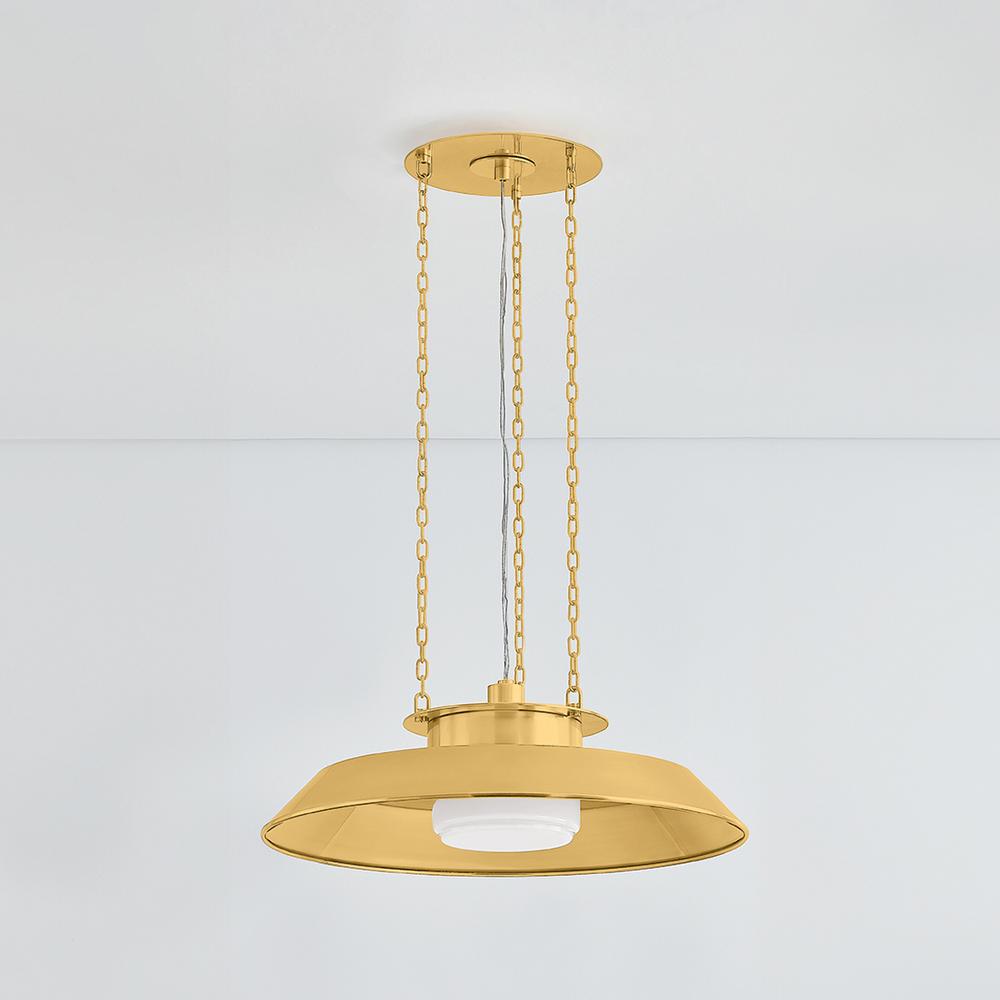 Taking cues from the innovative lamping techniques of bespoke maker brands, Woodrow features a classic RLM-style pendant silhouette. Beneath the large reflector, the opal shiny shade filters light both downwards and outwards. Three clean chains suspend this fixture, which is available in two sizes.