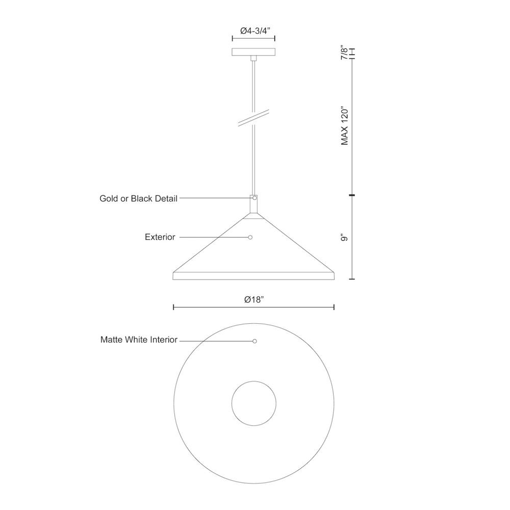 Single lamp pendant with conical aluminum shade with fine powder-coated or plated finishes with contrasting finial. Exterior shade colors are black or white with gold detail or brushed nickel with black detail. Suspended by cloth cable. Available in 2 sizes.