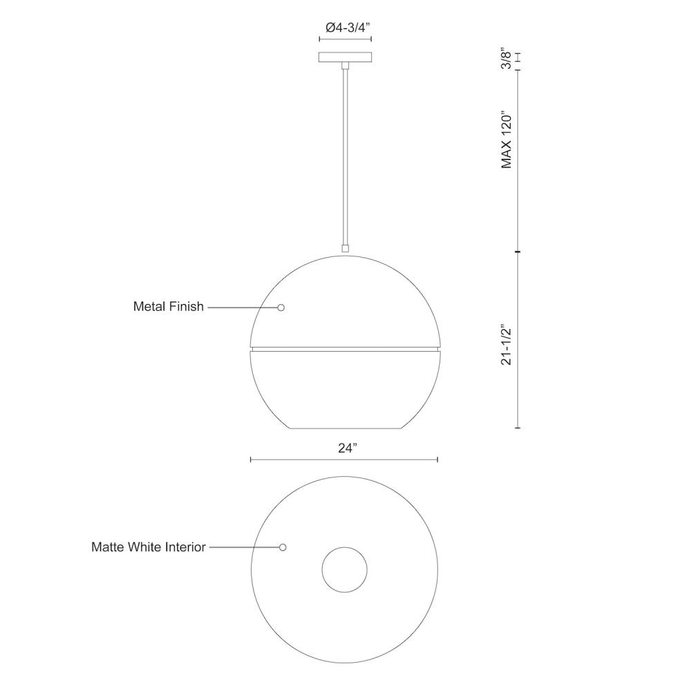 Single-lamp pendant with split spherical aluminum shade showcasing powder-coated finishes against a matte white interior. Exterior shade colors are gray, white or black. Suspended by cloth cable. Available in two sizes.
