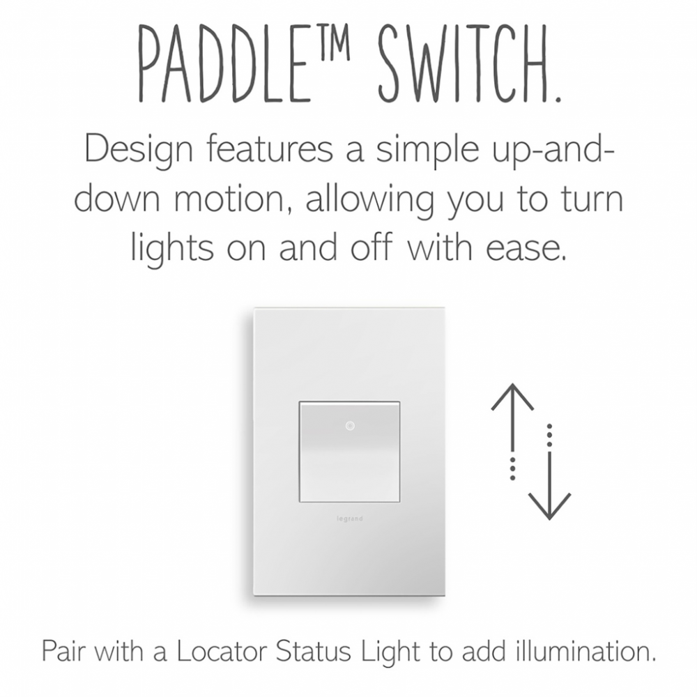 A modern twist on classic up-and-down light switch control, the Paddle Switch lets you turn lights on and off with ease and style. Use this 277V switch on its own to control a light or fixture from a single location, or pair with a second switch to control a single light source from two locations.This switch* features enduring Microban? antimicrobial technology that works to reduce the growth of bacteria, around the clock, for the lifespan of the product.* Existing inventory of switches, dimmers and plastic wall plates from the adorne? Collection at some partner locations may not yet include Microban? protection. To confirm that a specific Legrand product is protected with Microban?, check that the exterior of the product packaging includes a green dot or a ""Protected with Microban"" label.Made exclusively for use with screwless Wall Plates from the adorne? Collection, sold separately.No antimicrobial efficacy claims are being made or are valid with respect to products sold in Canada.