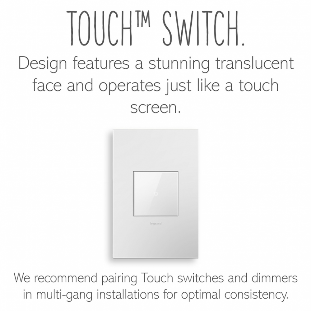 Perfect for anywhere you'd like to upgrade a standard switch with sleek, intuitive touchscreen technology. This stylishly minimalist modern light switch functions just like your smartphone's touch screen - simply touch your finger to turn lights on and off. Use this device on its own to control a light or fixture from a single location, or pair with a second switch to control a single light source from two locations (3-way control).This switch* features enduring Microban? antimicrobial technology that works to reduce the growth of bacteria, around the clock, for the lifespan of the product.* Existing inventory of switches, dimmers and plastic wall plates from the adorne? Collection at some partner locations may not yet include Microban? protection. To confirm that a specific Legrand product is protected with Microban?, check that the exterior of the product packaging includes a green dot or a ""Protected with Microban"" label.Made exclusively for use with screwless Wall Plates from the adorne? Collection, sold separately.No antimicrobial efficacy claims are being made or are valid with respect to products sold in Canada.