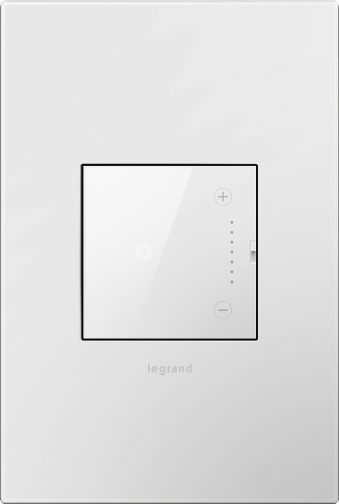 This dimmer switch from the adorne Collection features a translucent, glass-like face and operates with the simple touch of a finger on the center circle to turn lights on/off, or by using the + or - on the side to dim. In multi-gang installations, we recommend using the Touch-control modern light switches and dimmers together for consistency of control and aesthetic. A Tru-Universal Dimmer, this device self-calibrates to work with virtually any 120V dimmable bulb or fixture (excludes 0-10V).This dimmer* features enduring Microban? antimicrobial technology that works to reduce the growth of bacteria, around the clock, for the lifespan of the product.* Existing inventory of switches, dimmers and plastic wall plates from the adorne? Collection at some partner locations may not yet include Microban? protection. To confirm that a specific Legrand product is protected with Microban?, check that the exterior of the product packaging includes a green dot or a ""Protected with Microban"" label.Made exclusively for use with screwless Wall Plates from the adorne? Collection, sold separately.No antimicrobial efficacy claims are being made or are valid with respect to products sold in Canada.