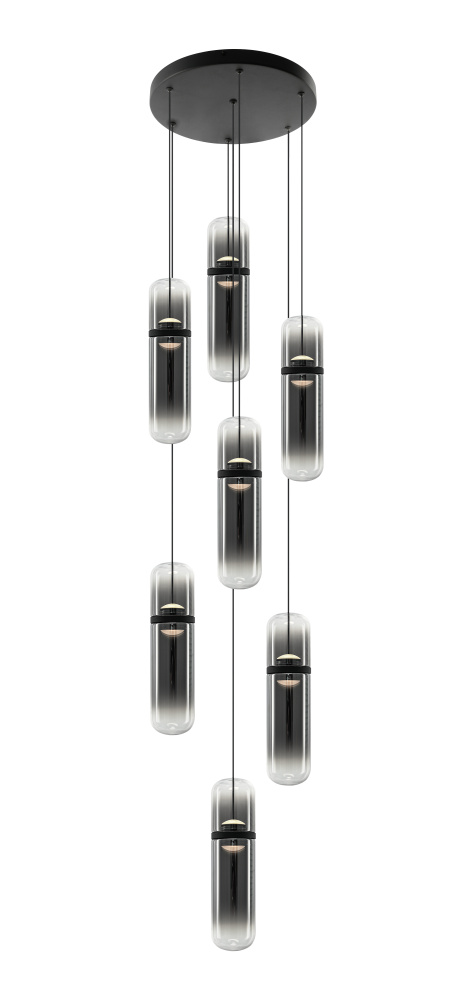 Amulet Sleek sophistication meets sculptural luminosity in this modern pendant series. Each elongated glass capsule features a softly tinted center that transitions to clear glass at the top and bottom, creating a refined gradient effect and warm, atmospheric glow. The Champagne Gold finish pairs with amber-tinted glass, while the Matte Black finish pairs with smoked-tinted glass, each offering a distinct and contemporary expression. Suspended from a coordinating canopy, the pendants float gracefully, adding movement and visual interest to any space. Features a 5CCT switch inside the canopy to adjust the 5 selectable colour temperature