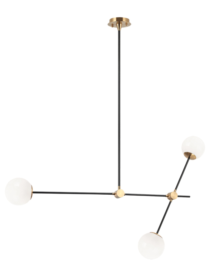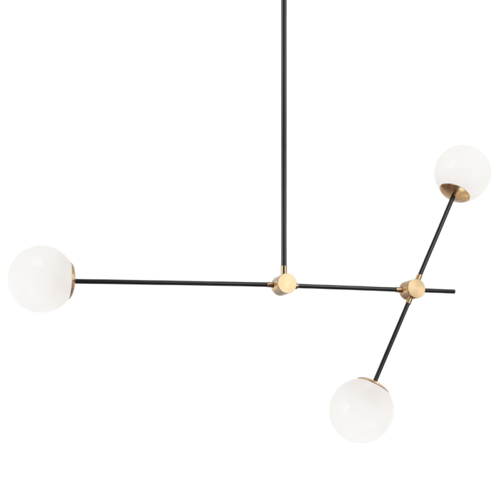 Cosmic is arranged with long, sleek, black slidable rods, paired with Aged Gold Brass finish details.This collection is available in 2 sizes in either Clear or Opal glass to provide a stunning yet minimalistic look.The creativity of this series adds a unique detail to any space.