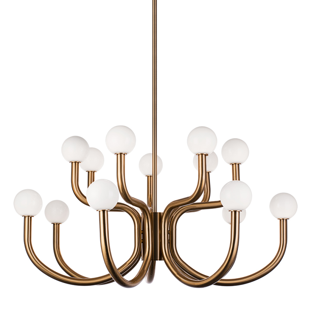 With flowing arms featuring round Opal glass, the Joelle incorporates a mix of style and elegance that could enhance the visual impact. Finishes include chandeliers and wall sconces in Aged Gold Brass and Matte Black.