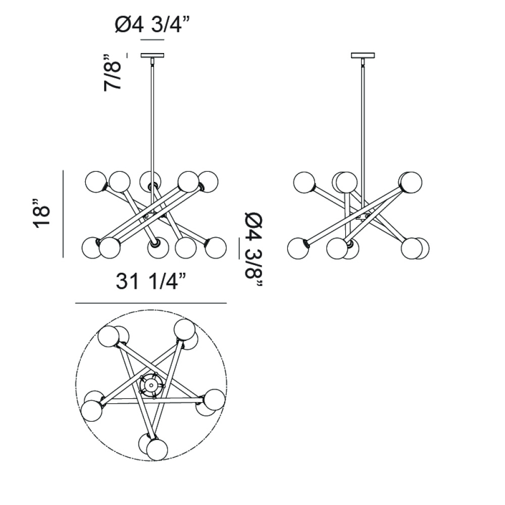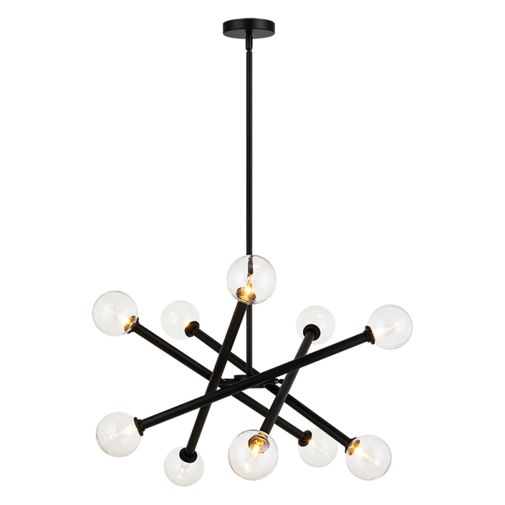 Matchstix chandelier will be a dramatic addition to any room. Modern movement in the crossing bar design will be a signature piece. Available in Aged Gold Brass or Black with either Clear or Opal glass.