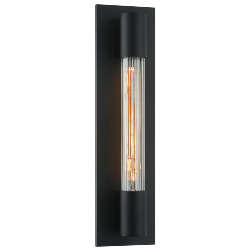 The Riely wall sconce is a whimsical play on the shape of a fuse, but far more elegant. The ribbed glass stands out against the Aged Gold Brass or Matte Black canopy and end caps resulting in a delightfully charming look.