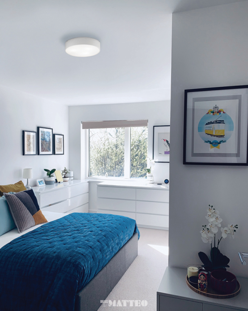 A classic round flush mount offered in two sizes and four finishes. Straight sided round metal bands finished in Aged Gold Brass, Bronze, Chrome or White completed with a frosted glass lens.