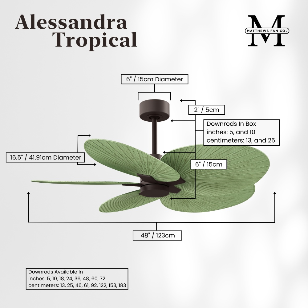 Minimal tropical form with maximum efficiency in 48". The thoughtfully crafted and versatile wet location Alessandra Tropical will complement any aesthetic and improve the health and comfort of any room. Highly customizable, the Alessandra Tropical is available in 5 different body finishes, 11 blade finish options and color changing light kit. Backed by a limited lifetime warranty, our fans are of the highest quality and will dutifully perform for years to come.