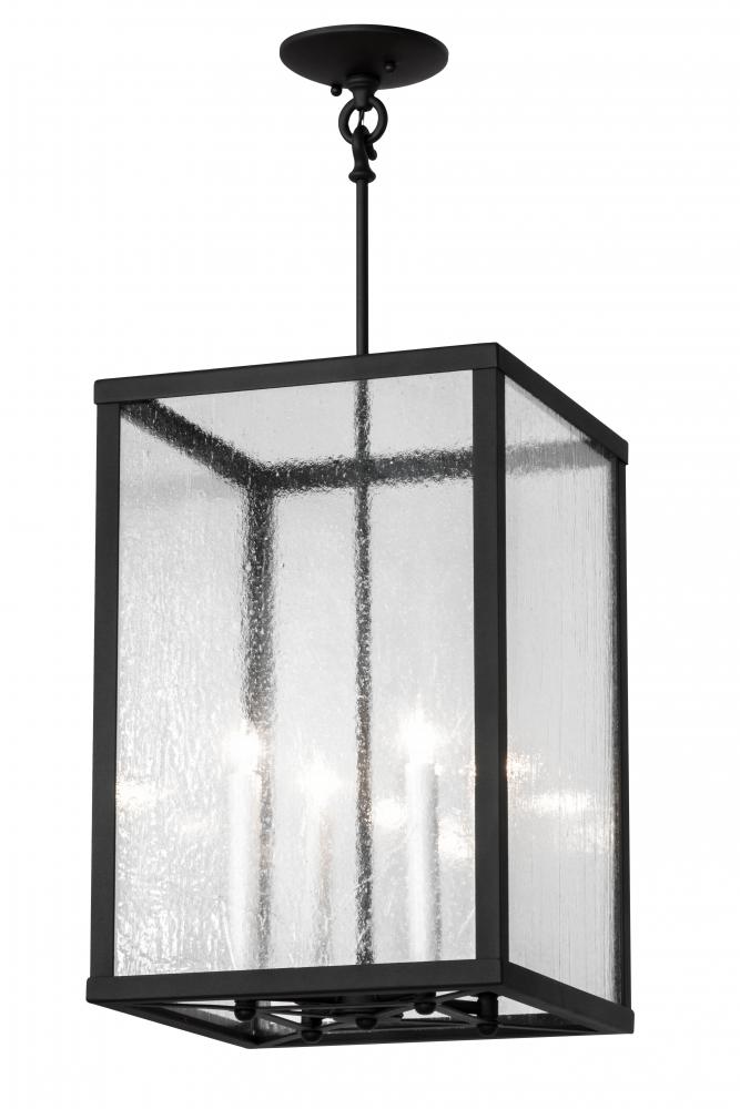 A sophisticated architecturally styled fixture is designed with a pizazz that is unique; fresh and stylish. Give your decor an extra edge with this breathtaking fixture; which is highlighted with a solid steel structure that surrounds a Clear Seeded glass lens encasing 4 faux candlelights. The hardware and frame; which includes a criss-cross hub design on its base; are featured in a handsome Wrought Iron finish. Handmade in our 180;000 square foot manufacturing facility in Yorkville; New York. Available in custom sizes; styles and finishes; as well as dimmable energy efficient lamping options such as LED. UL and CUL listed for damp and dry locations