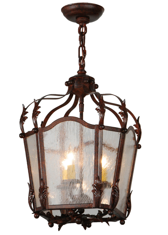 Utilizing a blend of timeless craftsmanship and classic design; the ever-popular Citadel brings home unsurpassed quality and shapely appeal. Evoking a dramatic effect; beautiful ambient light is evoked through Clear Seeded Glass which reveals a 3-light faux candelabra within this pendant. Citadel is enhanced with a dramatic design; stunning Acanthus leaf accents and frame featured in a Rusty Nail finish. The fixture is handcrafted by skilled artisans in our American factory in Upstate New York. Custom options include various sizes; colors; designs and dimmable energy efficient lamping. UL and cUL listed.