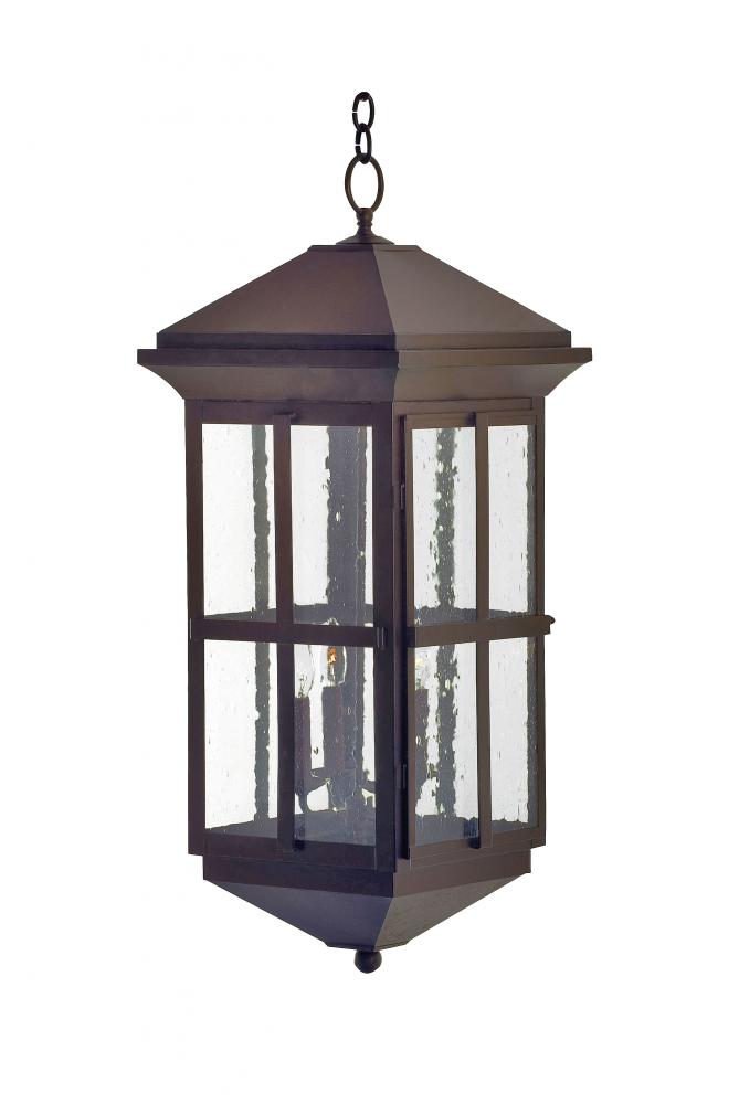 A sophisticated architecturally styled fixture is designed with a pizazz that is unique; fresh and stylish. Give your decor an extra edge with this breathtaking ceiling fixture; which is highlighted with a solid metal structure featuring Clear Seeded Glass that reveals 3 stylized Gilded Tobacco finished Candle Covers with Customer Supplied Candelabra Lamps. The hardware and frame are also featured in a matching Gilded Tobacco finish. Handcrafted in the USA; Myles is available in custom sizes; styles and finishes; as well as dimmable energy efficient lamping options such as LED. The 14-inch wide ceiling pendant is UL and CUL listed for damp and dry locations.