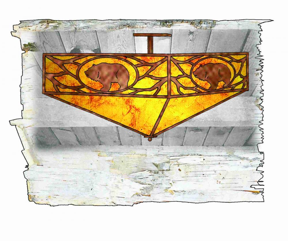 A wildlife inspired Grizzly Bear framed in branches tops this flushmount fixture. The rustic fixture is finished in Antique Copper; has Amber Mica panels; and is handcrafted in the USA by Meyda artisans.
