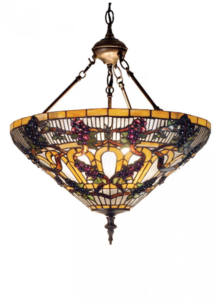 Radiant Concord Purple jewels; Vineyard Green leaves and glistening dew kissed Bark Brown vines wrap around Golden Sunshine bands; against a diamond grid of Clear Seeded glass. Bring sunny vineyards to your own home or business with this lovely Meyda original inverted pendant; which is created using the famous Meyda copperfoil construction. The coordinating hardware is featured in a warm Mahogany Bronze finish. UL and cUL listed for damp and dry locations. Custom colors; styles; sizes and dimmable energy efficient lamping options available.