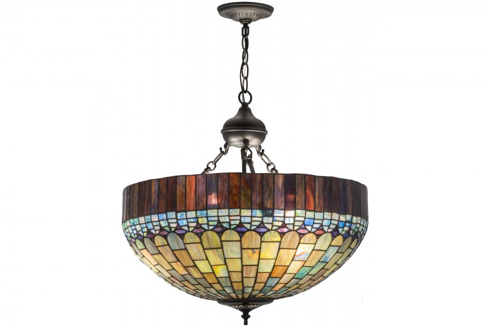 In the early 20th century; Tiffany Studios used its artful mastery to develop the look of woven fabric with a fringed skirt out of glass. Meyda Tiffany has taken that concept one step further and turned it upside down. Multi-hued Amber Plum fringe suspends an inverted dome brickwork intertwined with shades of Emerald; Cobalt; Heather; Byzantium; Navy and Amber art glass. The art glass shade is created using Meyda's famous copper foil construction process and is enhanced with hardware finished in Solar Black. Each shade is a unique work of art with color variations based on natural ingredients inherent in the glass. Contact us if color matching is critical when ordering multiple items.