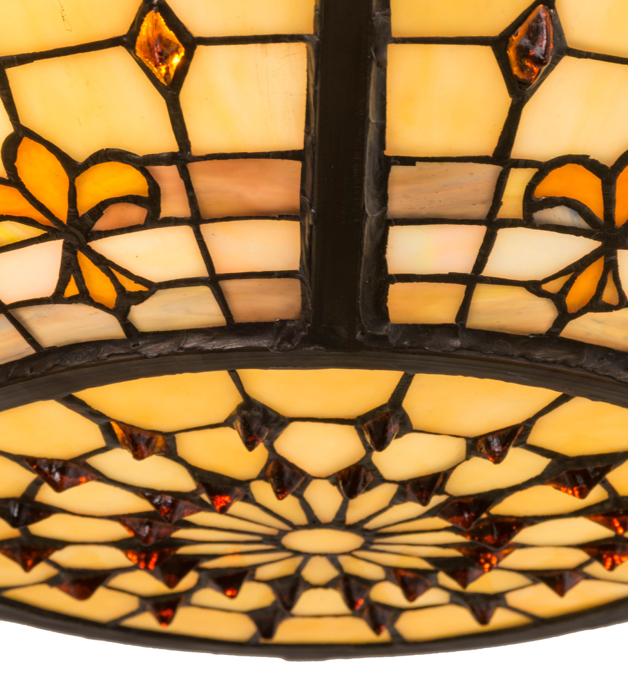 A Meyda Tiffany original design; the round Fleur-de-Lite fixture is an elegant design of Amber colored stylized three-petaled Lilies with complementary colored jewels. A stately hand crafted frame cradles the stained glass shade which is reminiscent of castle and cathedral glass. This fixture is finished in Mahogany Bronze and the shade is crafted using the famous copperfoil construction. Available in custom colors; designs; sizes and dimmable energy efficient lamping; this fixture is UL and cUL listed for damp and dry locations.