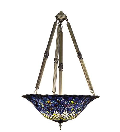 As distinctive as a beautiful Peacock's feathers; no two shades will ever be the same as their individuality can be as remarkably unique as their personality. This artistic creation utilizes swirling opalescent art glass background combinations including Beige Amber; Yellow Pinks; Red Purples; Golden Blues and Greens; Ivories; Bluish Whites; Turquoise Blues; Periwinkle; Olive and Spring Greens; Pale Yellow; Amethyst; Emerald and Topaz. The eye of the plumage design reveals Purples; Pastel Blues; Teals; Cobalt and Ivories. Individual pieces of glass are hand cut and wrapped using Meyda Tiffany's famous copperfoil construction. Each shade is a unique work of art with color variations based on natural ingredients inherent in the glass. Mahogany Bronze finish.