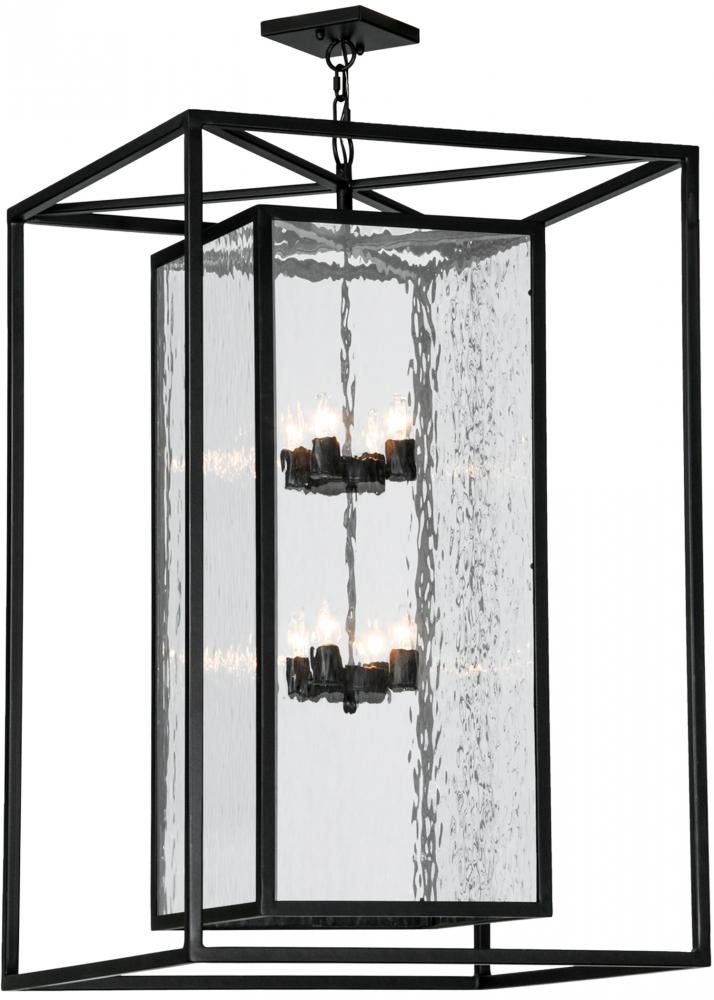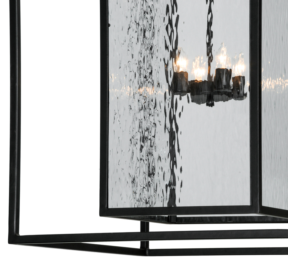 A sophisticated architecturally styled fixture is designed with a pizazz that is unique; fresh and stylish. Give your decor an extra edge with this breathtaking pendant; which is highlighted with a solid metal structure that surrounds a Clear Water Glass Lens. The sturdy hardware and frame are featured in a handsome Solar Black finish. Handcrafted in the USA; Kitzi is available in custom sizes; styles and finishes; as well as dimmable energy efficient lamping options. The 28-inch square fixture is UL and CUL listed for dry and wet locations.