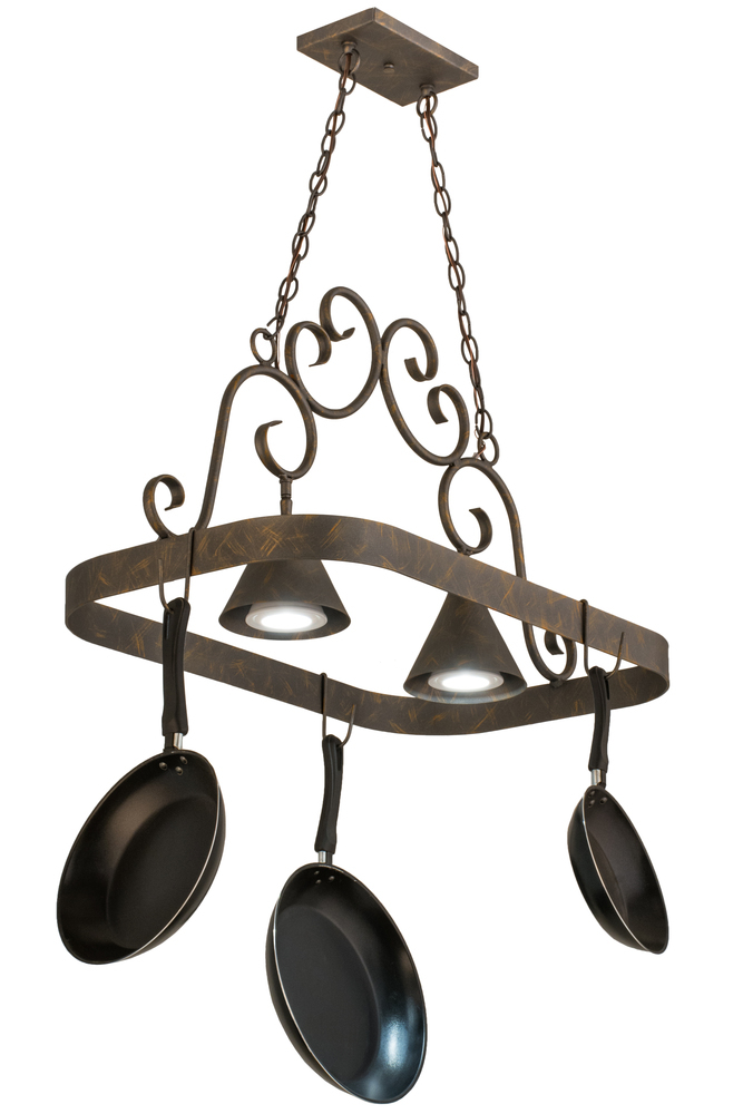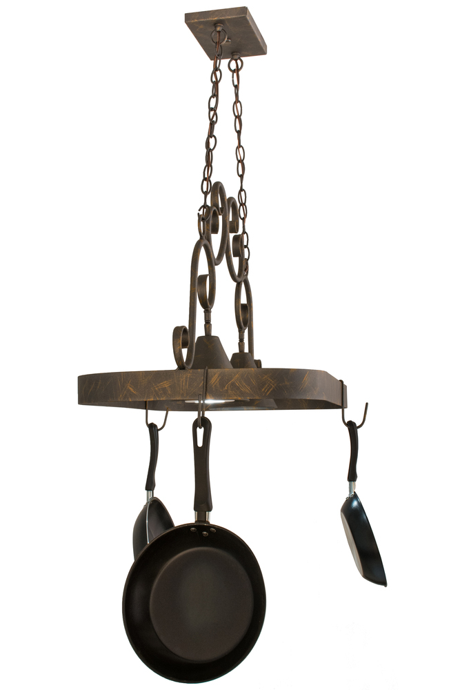 An upscale design that integrates form and function; Elana is highlighted with large scroll accents and a French Bronze finished frame with hooks to display fine cookware for easy access in kitchens. Two luminaires provide optimal downlighting to illuminate counter surfaces; tabletops; islands and architectural accents. Handcrafted in the USA by our highly skilled artisans; this fixture is available in custom sizes; styles; colors and energy-efficient lamping options.
