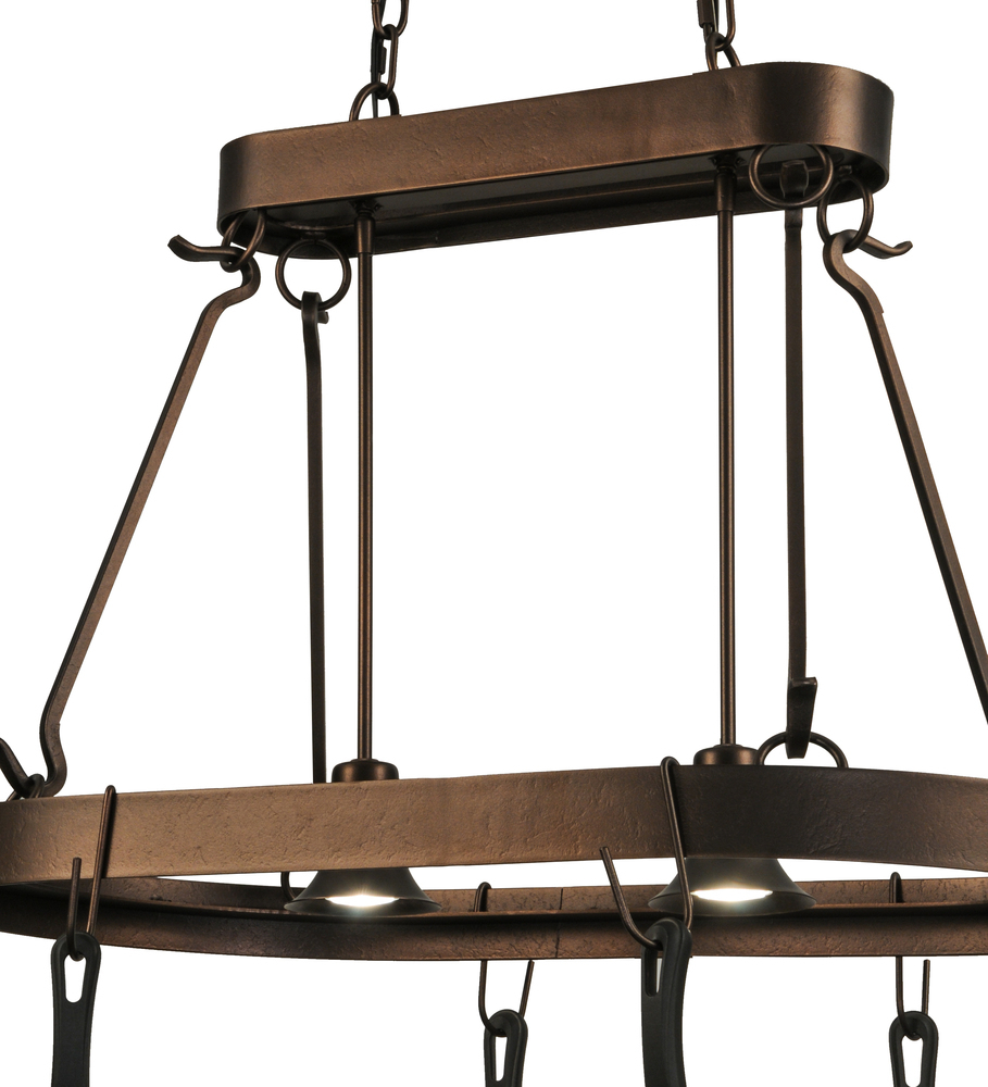 Rustic charm marries functional elegance with the Harmony Lighted Pot Rack. The functional oval-shaped lighted fixture features Mahogany Bronze finished hardware which is enhanced with hooks to display fine cookware and accessories. Two Medium base downlights deliver functional illumination over kitchen islands and other surfaces. The overall height ranges from 24 to 71 inches as the chain length can be adjusted in the field to accommodate your specific lighting application needs. Handcrafted by highly skilled artisans in our 180;000 square manufacturing facility in Yorkville; New York. Diffuser colors; metal finishes and fixture sizes can be customized. UL and cUL listed for dry and damp locations.
