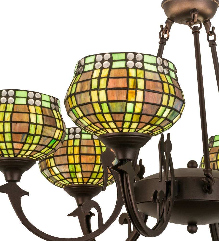 Like precious jewels hanging from the ear of a distinguished woman; these charming globe shaped shades of Amber Mauve and Bronzed Green edged art glass with Clear glass jewel accents; are embraced by the arms of this chandelier. The hand crafted Tiffany style shades; created using Meyda's famous copperfoil construction process; are complemented by hardware which is hand finished in Mahogany Bronze. Custom sizes; styles; colors and dimmable energy efficient lamping options are available.