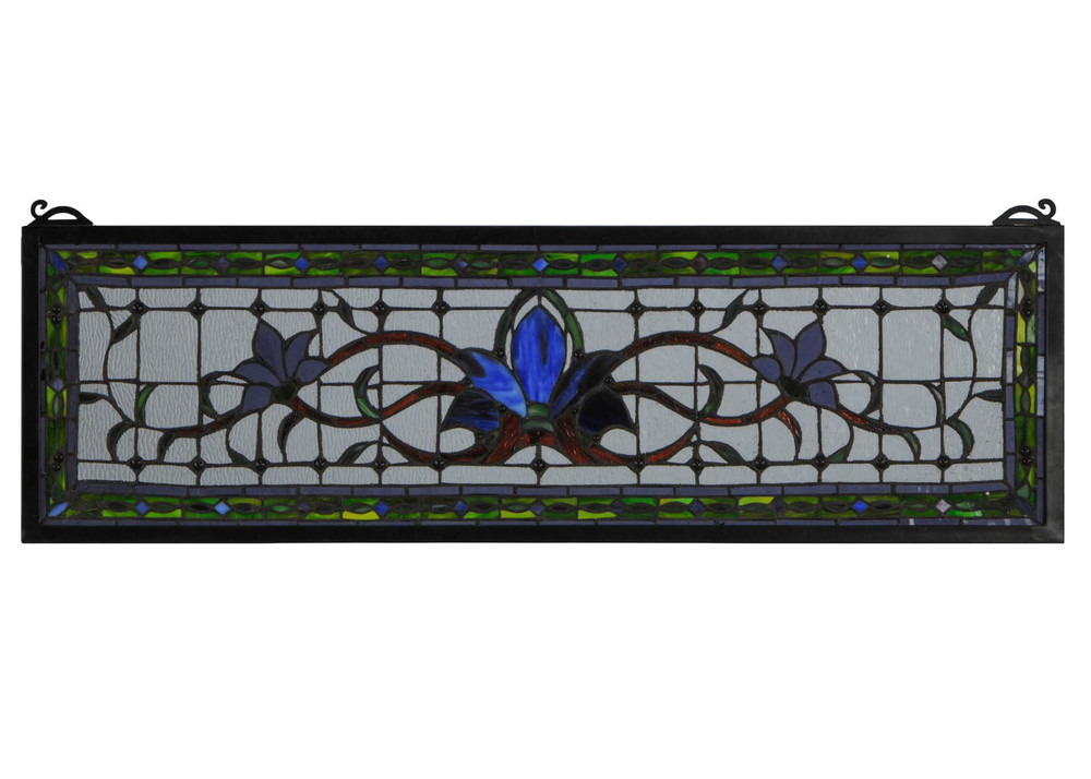 Herald in a touch of class to your home with this stylized floral stained glass window that features beautiful vivid colors in a simplistic design. At the focal point of this window is a cobalt flower flanked by violet flowers on each side. mahogany stems and green leaves wed the floral design on a clear back ground accented with plum jewels. A green chain link design accented with blue diamonds and plum jewels is surrounded by violet to complete the design. This stunning window is created using Meyda Tiffany?s famous copper foil construction process and attached to a Black frame. This transom window can be used above a door or placed as a pair on both sides of a door; especially in entryways. Brackets and hanging chains are included.